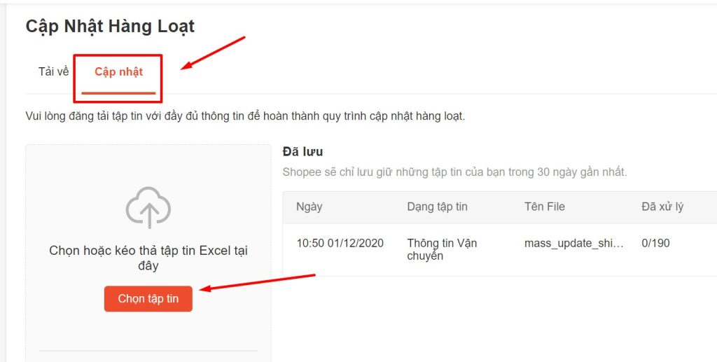 Bước 4: Sau khi lưu dữ liệu trong file Excel, quay trở lại màn hình Cập nhật hàng loạt trên Shopee, nhà bán hàng chọn sang tab Cập nhật/ click Chọn tệp tin để tải file vừa lưu. Sau đó chờ 5-10 phút hệ thống sẽ tự động load dữ liệu cho toàn bộ các sản phẩm.