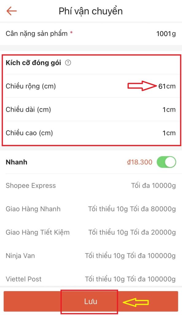 Để tắt thủ công, các nhà bán hàng truy cập vào từng sản phẩm, tại mục Kích cỡ đóng gói điền 1 thông số 61cm, 2 thông số còn lại điền 1cm.