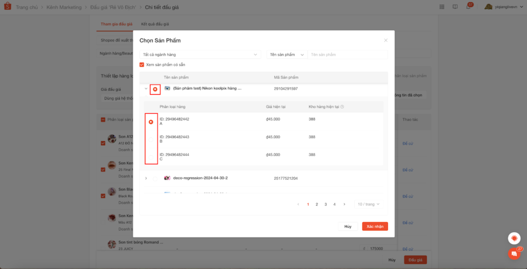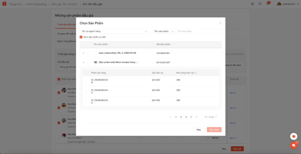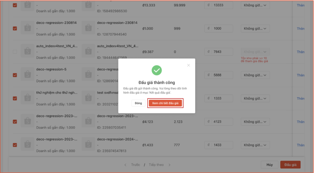 Kiểm tra sản phẩm của Shop được Shopee tự động đề xuất có phù hợp với sản phẩm đấu giá không.