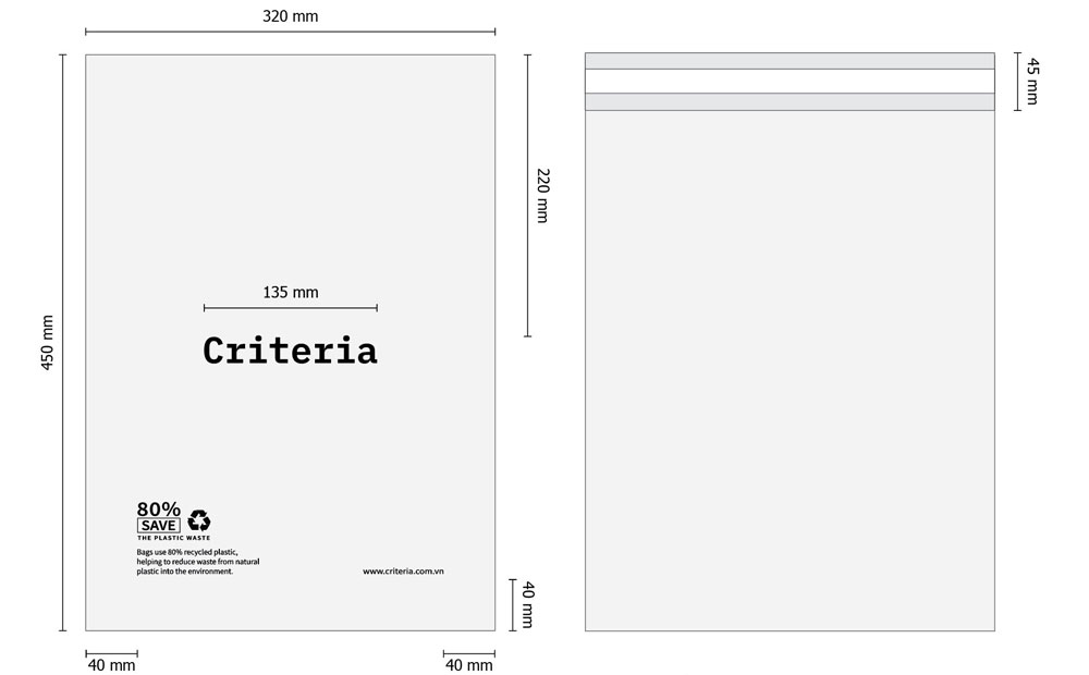 Criteria lựa chọn in túi gói hàng xám trắng, với thiết kế đơn giản nhưng cực kì nổi bật. Các sản phẩm của Criteria mang phong cách phóng khoáng kết hợp cổ điển vì vậy, màu túi xám trắng tinh tế là một lựa chọn không thể hoàn hảo hơn.