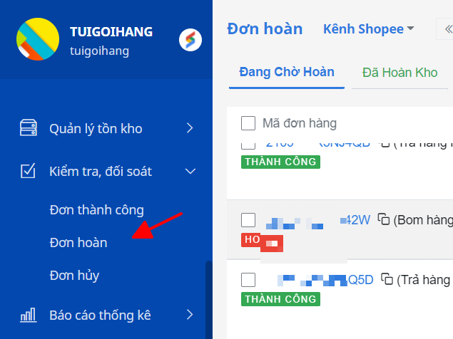 Bước 2: Chọn mục Kiểm tra, đối soát/ Đơn hoàn.