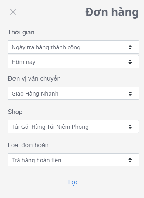 - Thời gian: chọn theo ngày trả hàng thành công. Vì các shop check theo ngày nên ngày nào sẽ lọc theo ngày trả hàng thành công ngày đó. Ngày trả hàng thành công là ngày mà hãng vận chuyển update trạng thái đơn hàng sang Đã trả hàng.