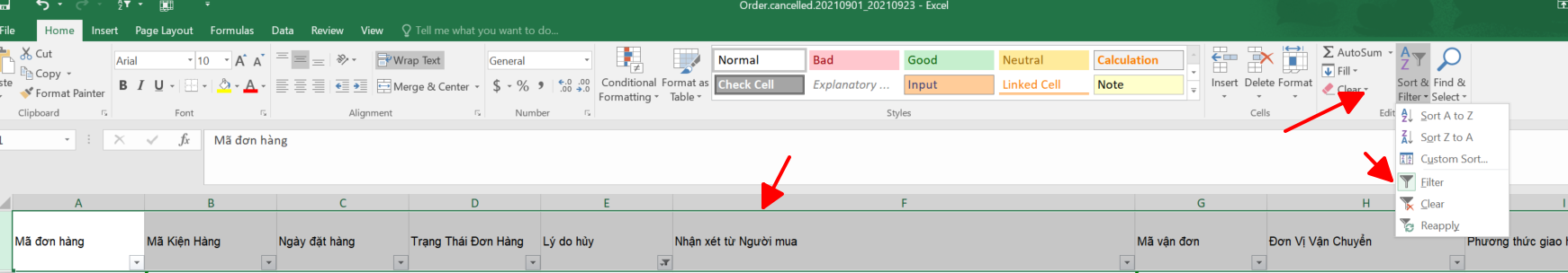 Bước 2: Tại file excel tải về, các shop chọn công cụ Fillter. Chọn hàng đầu tiên rồi ấn Fillter trên thanh công cụ. Tại mỗi cột sẽ hiển thị nút lọc.