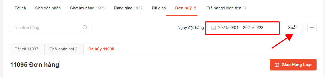 Bước 1: Truy cập vào mục Đơn hủy, chọn ngày cần lọc và click nút Xuất.