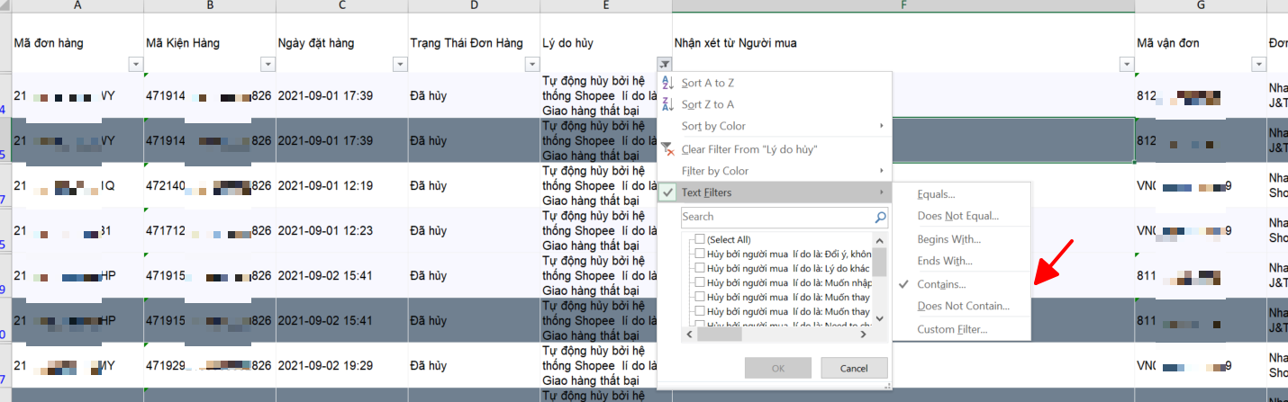Tại cột Lý do hủy, Quý vị click nút lọc. Chọn Text Fillter/ Contains…