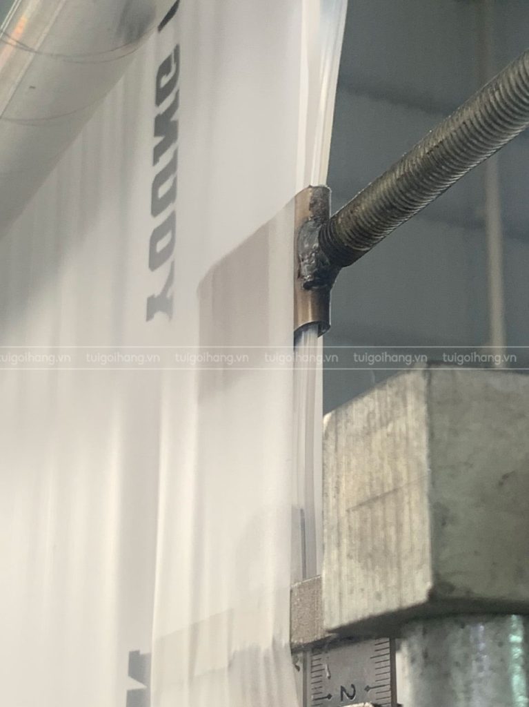 Ngay sau khi công đoạn dập hạt zip kết thúc, cuộn màng sẽ được chuyển sang máy cắt. Hai mép túi được cắt – hàn bằng dao cảm nhiệt giúp chiếc túi dính liền 1 cách tự nhiên, chống bục, chống rách, an toàn khi vận chuyển.