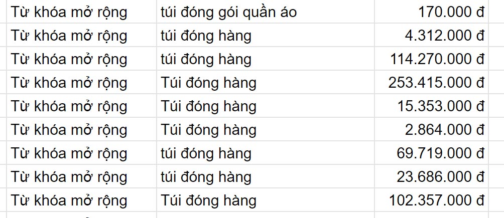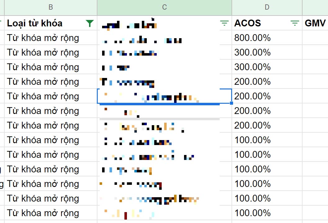 Tuy nhiên, nếu chạy quảng cáo với từ khóa mở rộng, File Excel tải về sẽ có đầy đủ các lệnh tìm kiếm theo từ khóa. Một từ khóa mở rộng có thể có tới 100-200 lệnh tìm kiếm, trong đó chỉ có 20% lệnh mang lại GMV (Gross Merchandise Volume – tổng giá trị sản phẩm được bán ra từ quảng cáo).